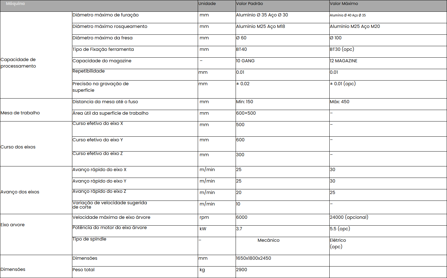 Os eixos X, Y e Z oferecem cursos de 500 mm, 600 mm e 300 mm, respectivamente, com avanços rápidos de até 30 m/min, garantindo agilidade e eficiência no ciclo produtivo.