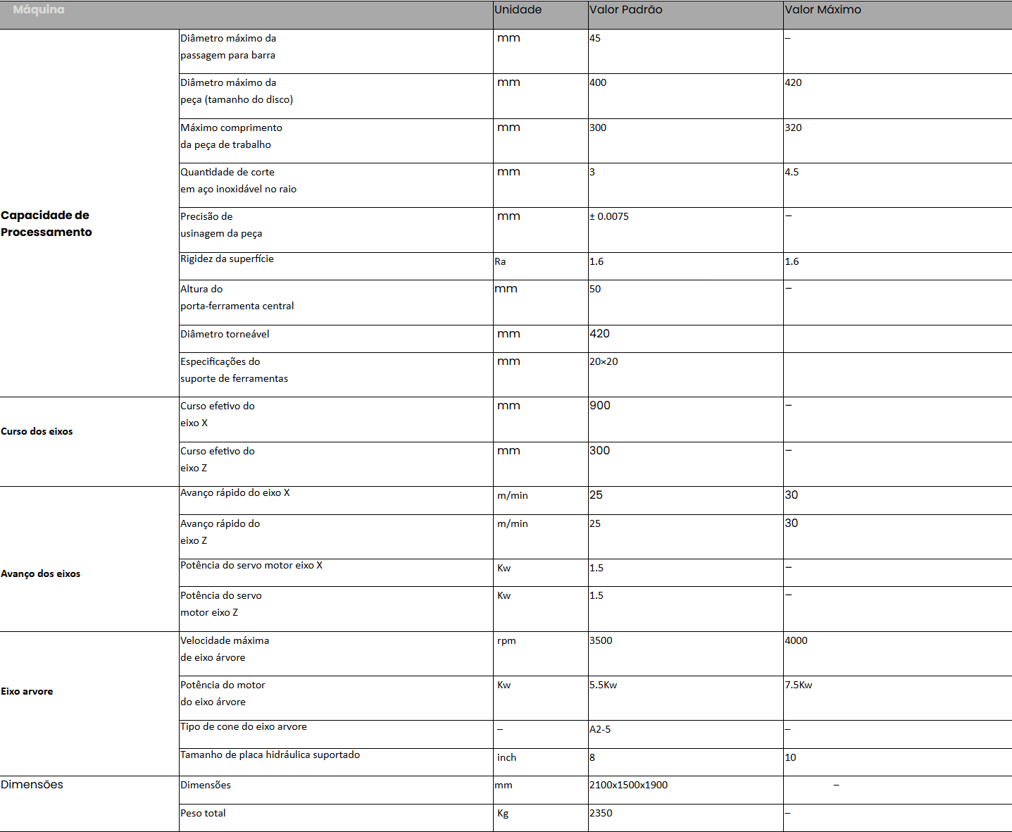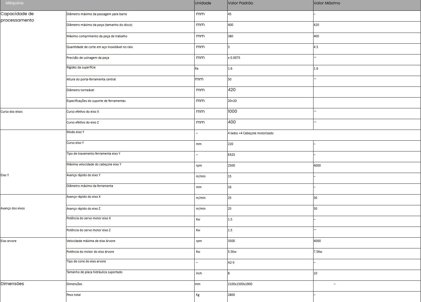 Com diâmetro máximo de peça de 400 mm e comprimento de corte de até 400 mm, ela permite a produção de componentes com excelente acabamento superficial, alcançando rigidez Ra 1.6 e precisão dimensional de ± 0.0075 mm.